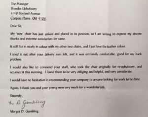 This note is to thank you for your recent work on upholstering our lounge suite. Specifically, we wish to thank you for your excellent service you extended to us, as well as your workmanship. We were very happy with the way our newly upholstered lounge was returned to us.
